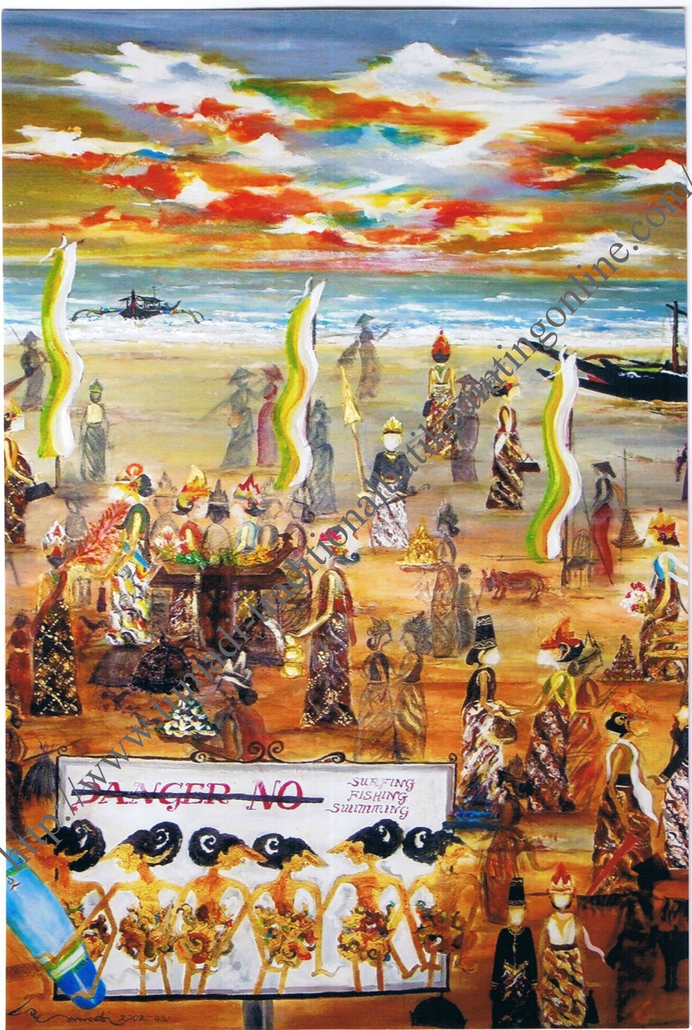 I like to promote n to show how interesting"Wayang Kulit"is.As a "Pak Dalang" or story teller,I recite the stories which connected to "Wayang Kulit" or Puppets."Wayang Kulit" have their own character,stories n names.Different names are connected with the title of paintings.Every color has its own identity.For instance black represent blood and meat,brown the sky,yellow depicts the air and red anger.I bring this stories and character into Wayang Painting as my signature.